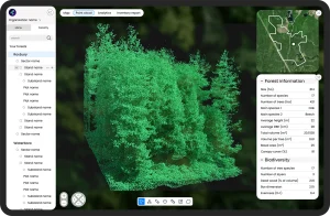 Each plot includes a LiDAR-based 3D representation, enabling virtual review of forest structure and stand characteristics.
